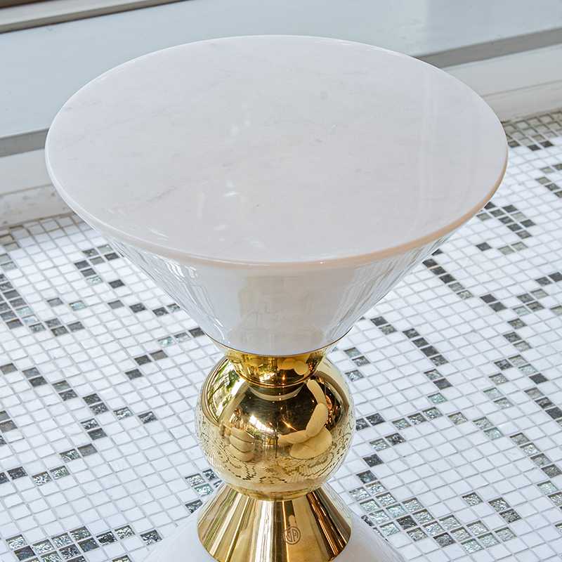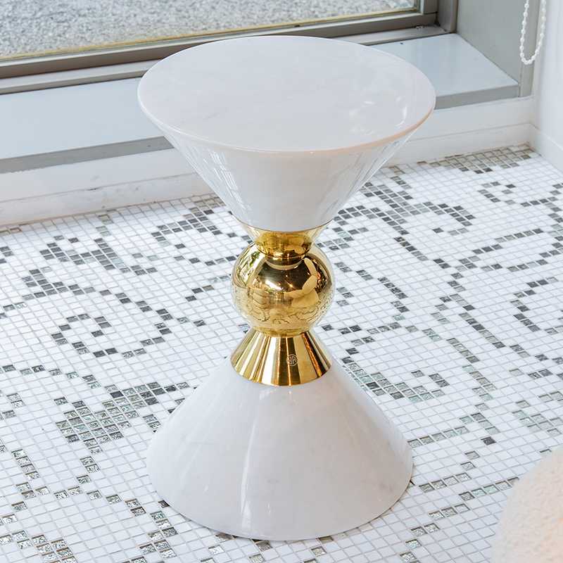 無垢の大理石でできた二つの円錐の間に真鍮の球体をサンドイッチした幾何学的なデザイン。