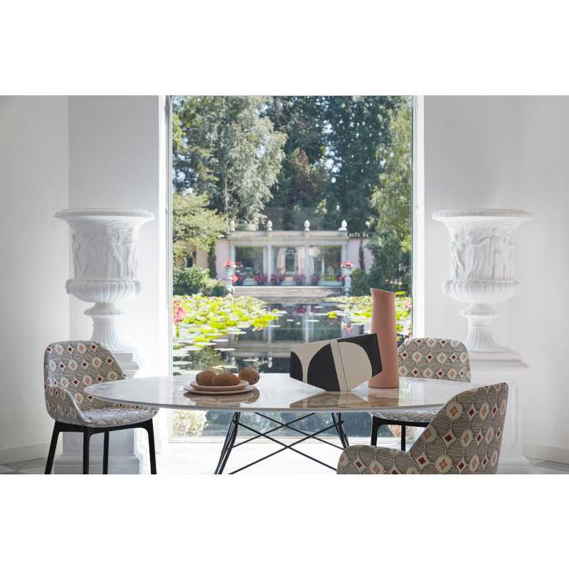 ラウンド型で脚は中央寄りなので奇数でも偶数でも人数調整がしやすいことや、どこに座っても自然に身体が向き合いコミニケーション性が良好なのも変わらぬポイントです。
