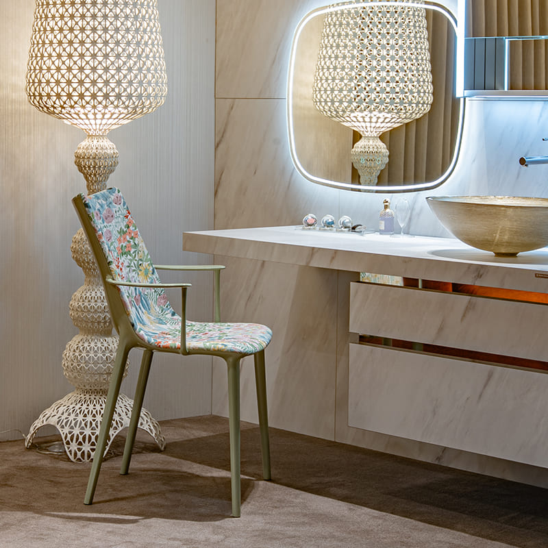4. 先端技術による表現力の革新 Kartellが新たに導入した「グラフィックインプレッション」技術により、複雑な曲面にも高精度でパターン転写が可能に。 花柄や幾何学模様など、視覚的にも豊かな表現が可能となり、デザインの幅を広げています。