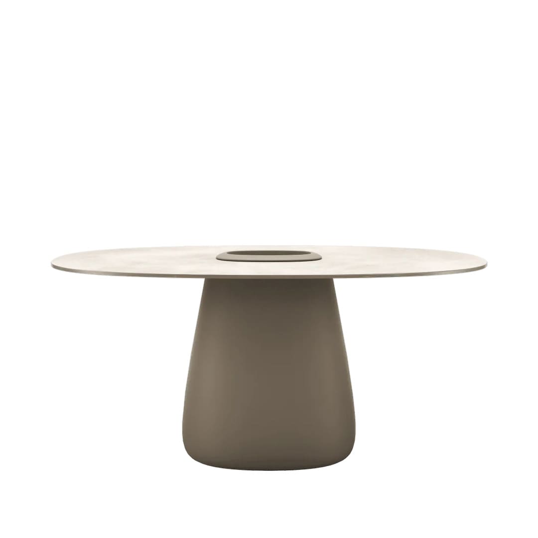 川底の丸石を思わせる有機的なフォルムに、テーブルの中心に植物や氷を仕込む遊び心を添えて。