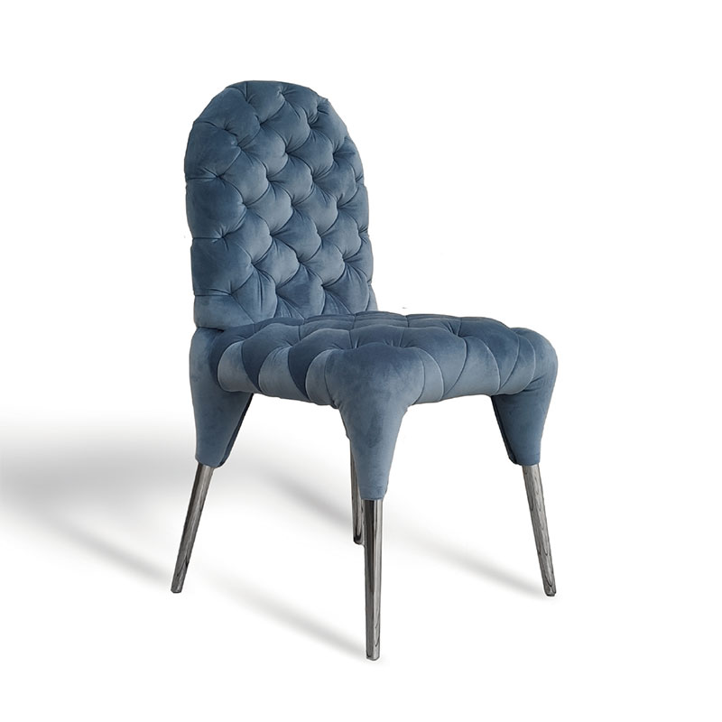 さらに、ブルーレザーの質感と造形が印象的な「集(つどい)」チェアが、エレガンスにひとさじのアクセントを加えています。