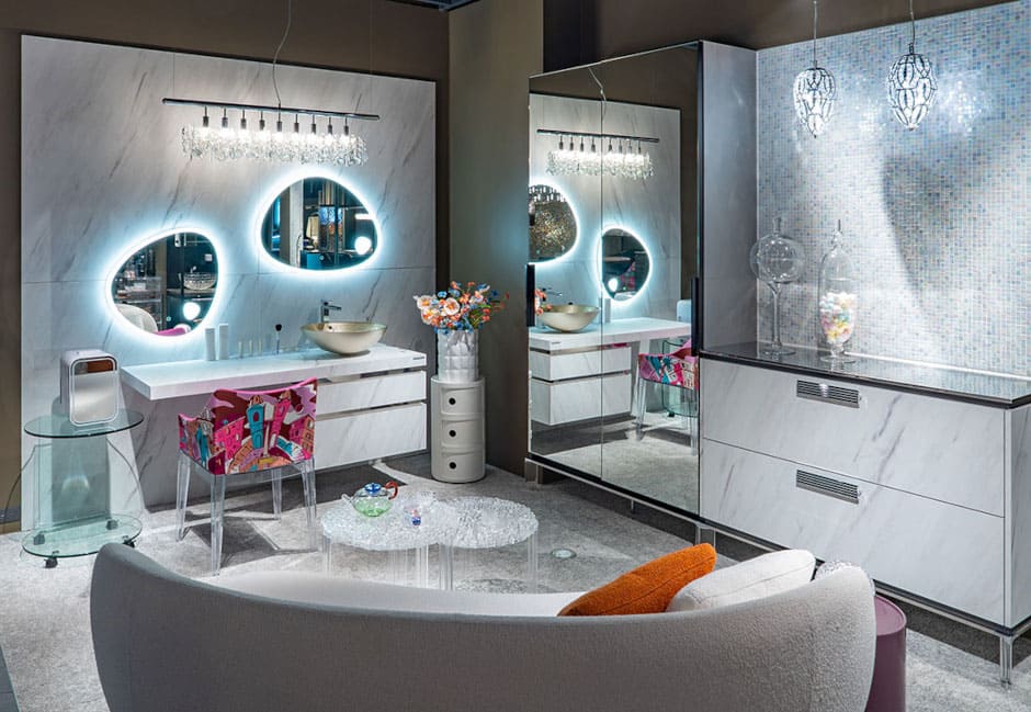 さらに、プッチ柄が印象的なKartellの「マダム」チェアを一点投入することで、空間に装飾性とアート性をプラス。