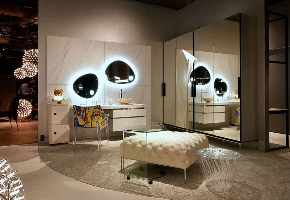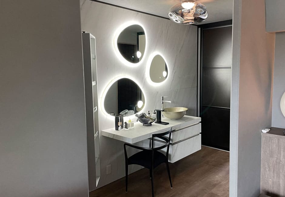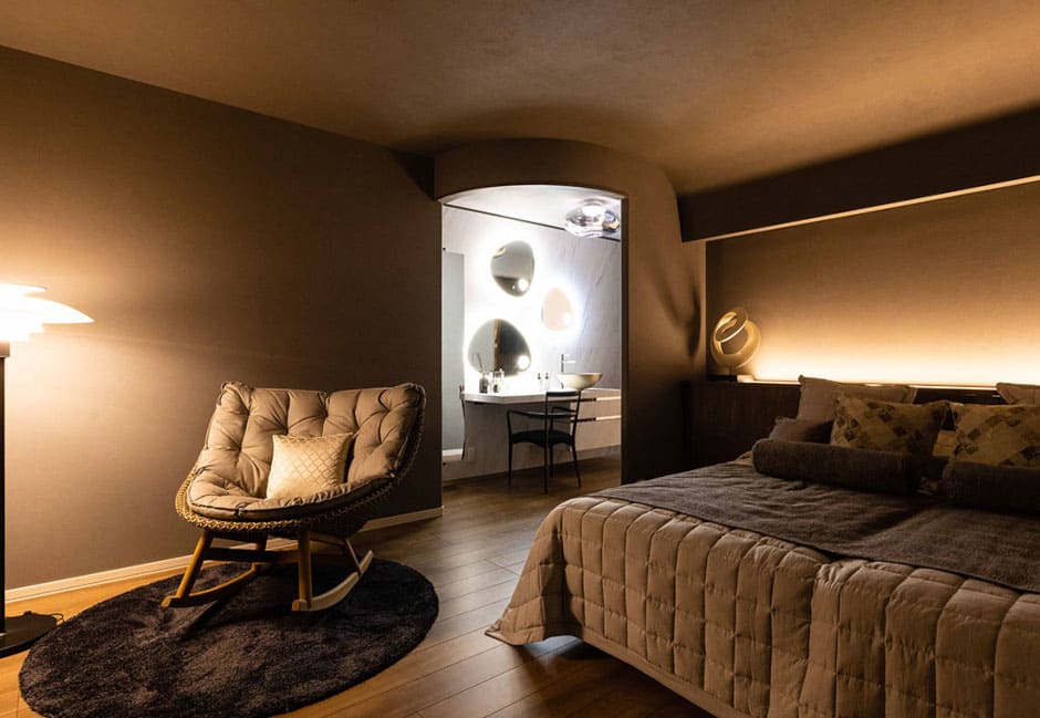 今回ご紹介したように、素材の質感やミラーの形状、そしてアクセントとなる家具の選び方ひとつで、空間はまるでブティックホテルのような開放感を持った非日常にも、静けさに包まれた大人の隠れ家にもなり得ます。