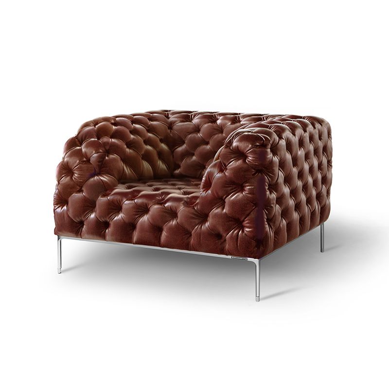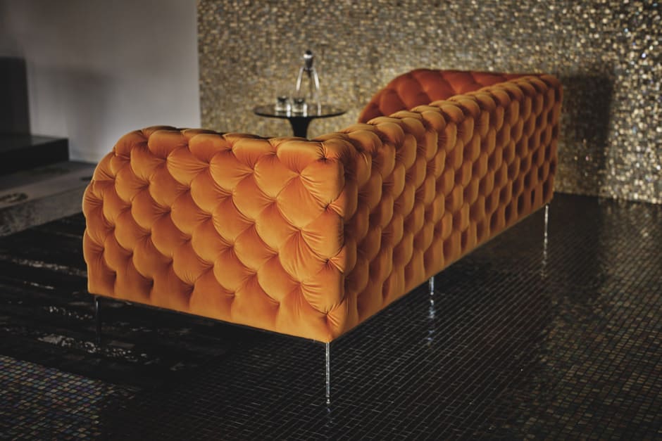 背もたれのボタンやラウンドフォルム、パイピングがアクセントとなり、視線を惹きつける佇まい。