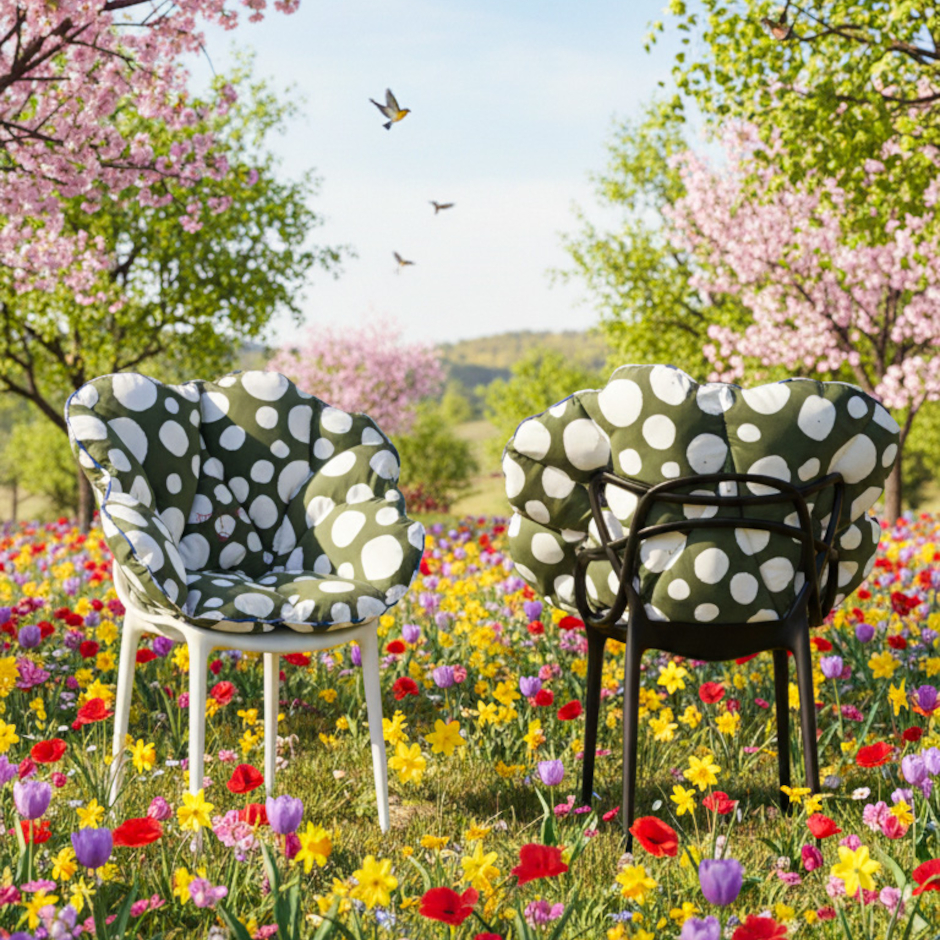 最先端の印刷技術により、繊細な花柄や幾何学模様がチェアの曲線美を彩ります。