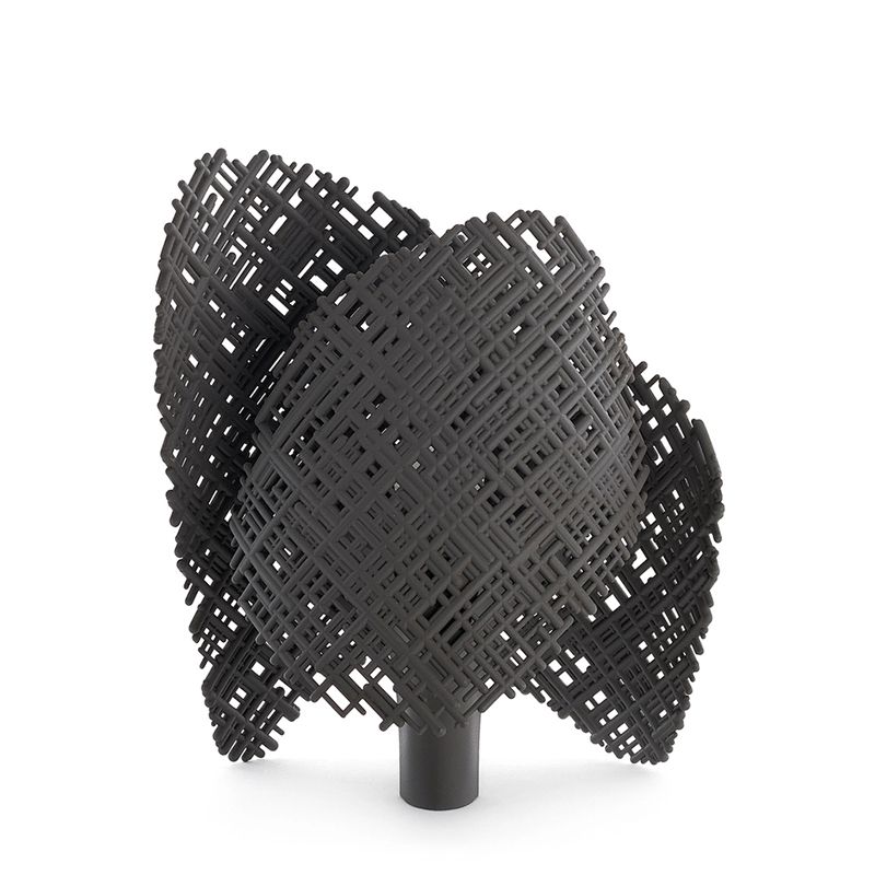繊細な糸をランダムに巻き付けたシェードが、やわらかな光を広げる「ランダムフロアランプ 2S」。