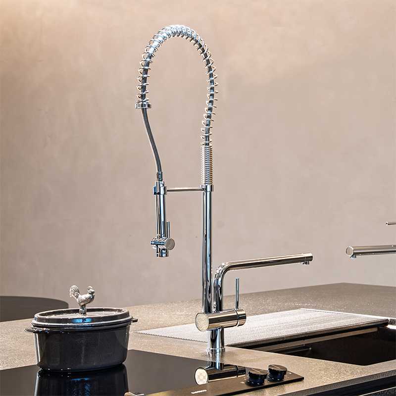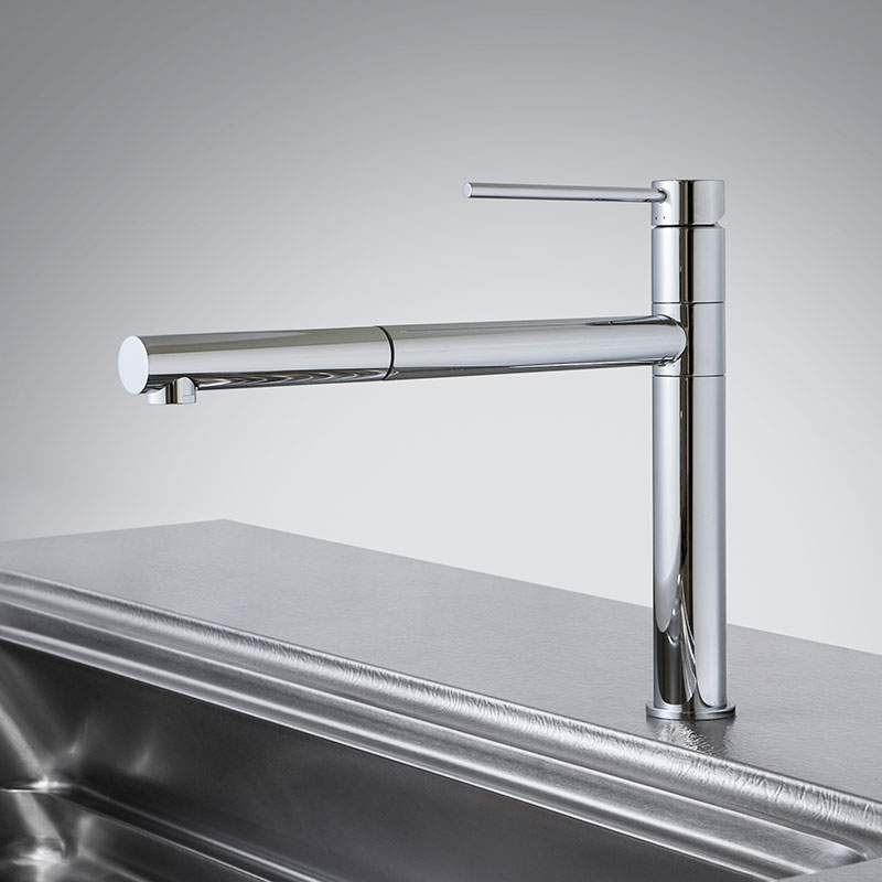 ゼロ動線水栓は、360度回転可能なスプリングホース付きシングルレバー混合水栓です。